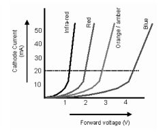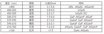 LED發(fā)光顏色由材料決定,材料不一樣導(dǎo)致了不同的顏色。發(fā)光管發(fā)出白色是幾種顏色的混合,不能直接發(fā)出白光。理論和實踐證明,光的峰值波長λ與發(fā)光區(qū)域的半導(dǎo)體材料禁帶寬度Eg有關(guān),即:λ≈1240/Eg(mm) 式中Eg的單位為電子伏特(eV)。若能產(chǎn)生可見光(波長在380nm紫光~780nm紅光),半導(dǎo)體材料的Eg應(yīng)在3.26~1.63eV之間。比紅光波長長的光為紅外光?,F(xiàn)在已有紅外、紅、黃、綠及藍(lán)光發(fā)光二極管,但其中藍(lán)光二極管成本、價格很高,使用較少。LED的一個重要參數(shù)是正向?qū)妷篤F,這個值一般是定義在正向?qū)娏髟?0mA下。不同顏色LED的正向?qū)妷翰灰粯?,如圖4所示。表2總結(jié)了各種顏色LED的波長、正向電壓、材料和發(fā)光顏色間的關(guān)系。可以看出,波長越小,正向電壓越大。