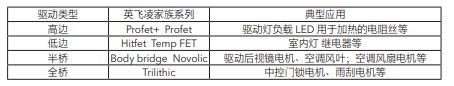 這四種拓?fù)涑2捎瞄_關(guān)器件來實現(xiàn),開關(guān)器件種類很多,其中常見的有機(jī)械開關(guān)和半導(dǎo)體開關(guān)兩種,出于能效和壽命方面的優(yōu)勢,目前半導(dǎo)體開關(guān)是BCM設(shè)計中的主流選擇。半導(dǎo)體開關(guān)中有三極管、MOSFET和IGBT等。在車身電子中,大多數(shù)負(fù)載采用帶保護(hù)和診斷的MOSFET來驅(qū)動。英飛凌作為全球第一大功率器件供應(yīng)商,為客戶提供了豐富的功率器件家族供選擇,如表3所示。
