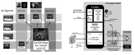 隨著汽車電子的發(fā)展,目前BCM設(shè)計的趨勢是平臺化和高集成度化兩個趨勢。平臺化SBC、SPI器件、共用ADC,以及高低邊可配等。 主要通過器件的兼容性來實現(xiàn)。集成度主要是提高器件的集成度,例如采用系統(tǒng)基礎(chǔ)芯片將電源、CAN收發(fā)器、LIN收發(fā)器集成到一個芯片上,在功率輸出方面采用SPI控制的多通道器件實現(xiàn)集成。英飛凌半導(dǎo)體在這兩方面均有豐富的產(chǎn)品鏈,如TLE826X和TLE926X系列SBC器件,多路高低邊SPOC和SPIDER家族。圖14(a)是BCM平臺化示意圖。