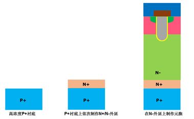 PT:以高濃度的P+直拉單晶硅為起始材料,先生長一層摻雜濃度較高的N型緩沖層(N-buffer層),然后再繼續(xù)淀積輕摻雜的N型外延層作為IGBT的漂移區(qū),之后再在N型外延層的表面形成P-base、N+ source作為元胞,最后根據(jù)需要減薄P型襯底。如果要制作1200V或1700V耐壓的產(chǎn)品,需要比較厚的N-外延層,制作難度較大,且成本很高。