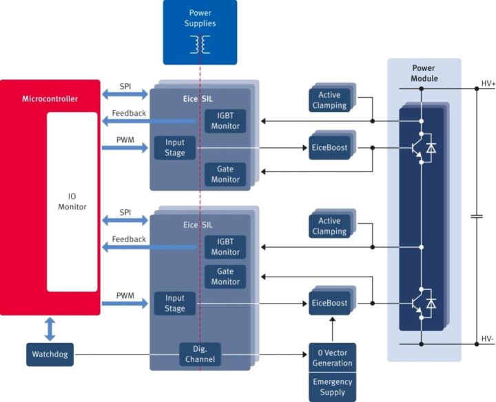 EiceDRIVER Boost是增強(qiáng)了輸出電流能力的推挽輸出放大器,并集成了相關(guān)保護(hù)能力。它有一個專屬的輸入口,可以將輸入驅(qū)動PWM信號推動IGBT。來自于看門狗IC的信號,控制控制PWM是否能驅(qū)動IGBT。IGBT門級信號監(jiān)視器和輸出級監(jiān)視器等多項(xiàng)監(jiān)測功能,可保證安全監(jiān)控路徑的可靠。