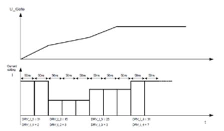 斜率控制功能集成在預(yù)驅(qū)動模塊,直接控制驅(qū)動電流,間接的把MOSFET的門級電壓上升或者下降曲線分為四段分別控制;每一段曲線可以通過寄存器設(shè)置驅(qū)動MOSFET電流的大小(32個等級)和時間(8個等級,50ns到400ns),靈活性非常高,如下圖所示:
