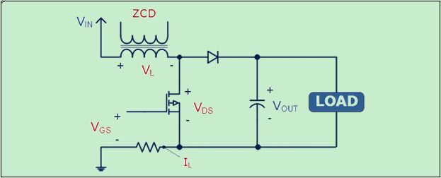 準(zhǔn)諧振開關(guān)始終在非連續(xù)導(dǎo)通模式下運(yùn)行,要求使用零電流檢測(cè)(ZCD)電路來迫使下一個(gè)開關(guān)周期在最低VDS(即,波谷)開始。