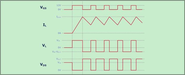 類似于臨界導(dǎo)通模式,由于MOSFET中的開啟損耗有所降低,這種導(dǎo)通模式的能效相對(duì)較高。該仿真為升壓轉(zhuǎn)換器在非連續(xù)導(dǎo)通模式下運(yùn)行時(shí)的狀態(tài)。