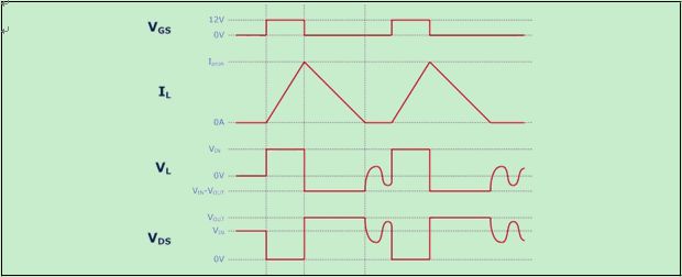 在升壓轉(zhuǎn)換器中,當(dāng)電感電流到達(dá)零時(shí),輸出二極管變?yōu)榉聪蚱?。這可防止當(dāng)輸出電壓高于輸入電壓時(shí),電流在反方向上流動(dòng)。此時(shí),VDS恢復(fù)穩(wěn)定狀態(tài),即到達(dá)輸入電壓。受MOSFET中的寄生電容和來自磁性組件的電感的影響,VDS在到達(dá)穩(wěn)定狀態(tài)之前表現(xiàn)出欠阻尼振蕩。