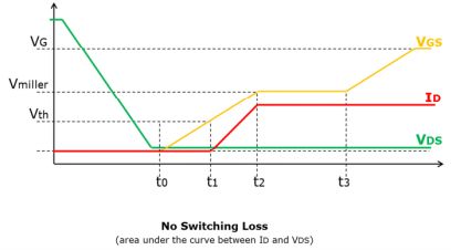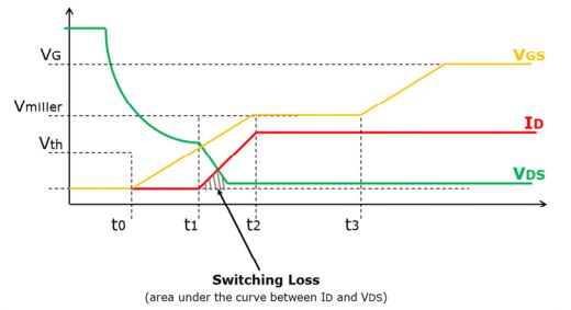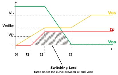 鉗位感性負(fù)載應(yīng)用(如升壓轉(zhuǎn)換器)中用作開關(guān)元件并在連續(xù)導(dǎo)通模式下運(yùn)行時(shí),其導(dǎo)通和關(guān)斷開關(guān)過程并非瞬時(shí)完成。有一個(gè)短暫瞬間,其VDS和ID相互重疊。這是開關(guān)損耗的主要源頭,它在很大程度上受MOSFET寄生電容的影響。