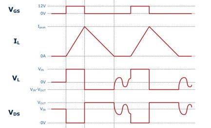 非連續(xù)導(dǎo)通模式的特征是,在下一個(gè)開關(guān)周期開始之前,電感電流保持為零一段時(shí)間。非連續(xù)導(dǎo)通模式的實(shí)現(xiàn)通常采用恒頻開關(guān)和較小占空比,并且一般而言,下一個(gè)開關(guān)周期不以任何方式與漏源電壓(VDS)振蕩同步。