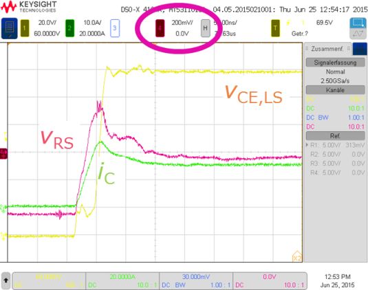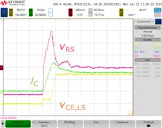 由于線路和電阻上的漏感,采樣信號會畸變。假如我們常用下圖的采樣電阻,在T = 25°C, VDC = 125 V, diC/dt = 590 A/μs時測得波形如下: