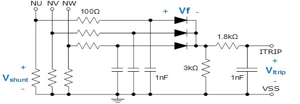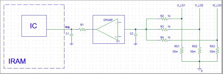 在家用電器等應(yīng)用中常使用單電阻采樣電路,并通常使用RC低通濾波器消除采樣電阻上的高頻噪聲。下圖是采用單電阻采樣的典型電路。