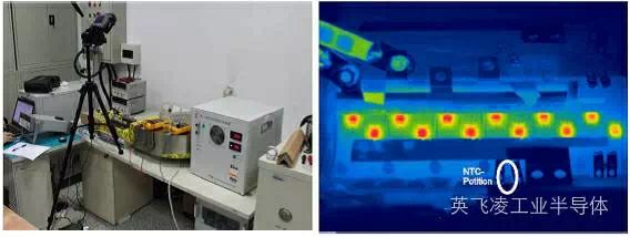 圖1:左-測溫試驗臺,由IGBT模塊,電源,數據采集系統,冷卻設備和測溫設備組成 右-被測IGBT模塊的紅外圖像,只加熱二極管芯片