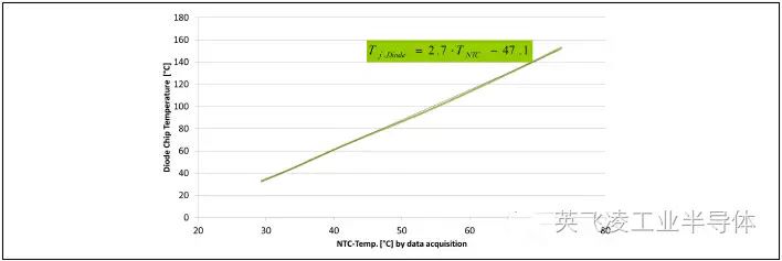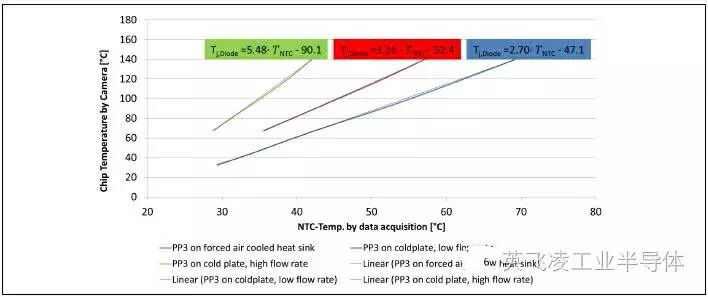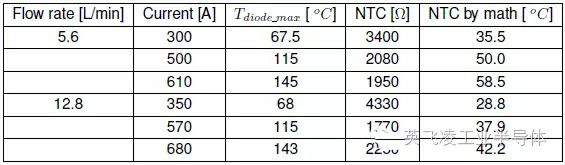熱測試結果表明,芯片和NTC電阻之間的溫度差隨冷卻系統性能的提升而增加,所以對于不同的系統應用工況,無法給出通用的芯片-NTC電阻溫度曲線。