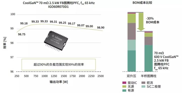 更厲害的是,600V CoolGaNTM產(chǎn)品可支持采用簡單的PFC半橋圖騰拓撲(包括棄用有損輸入橋式整流器)。在方案設(shè)計者可以在兩種不同的結(jié)果中進行選擇:一種是效率略微提升但BOM成本顯著下降,另一種則是效率大幅度提升(>99%)但BOM成本有所增加,如下圖所示。